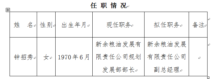 为加强新余粮油发展有限责任公司领导班子建设,根据民主推荐和考察情况,经市粮食局党委研究决定,现将钟招秀同志拟任职情况进行公示,欢迎广大干部、群众对她的德、能、勤、绩、廉和遵纪守法情况进行监督,对公示对象有反映问题的,可拨打局机关党委电话,联系电话:6440672,监督电子举报信箱:1486273123@qq.com