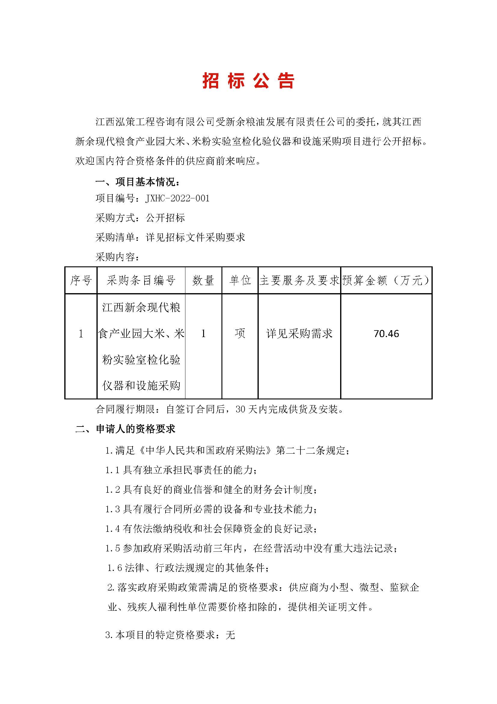 江西新余现代粮食产业园大米、米粉实验室检化验仪器和设施采购招标公告