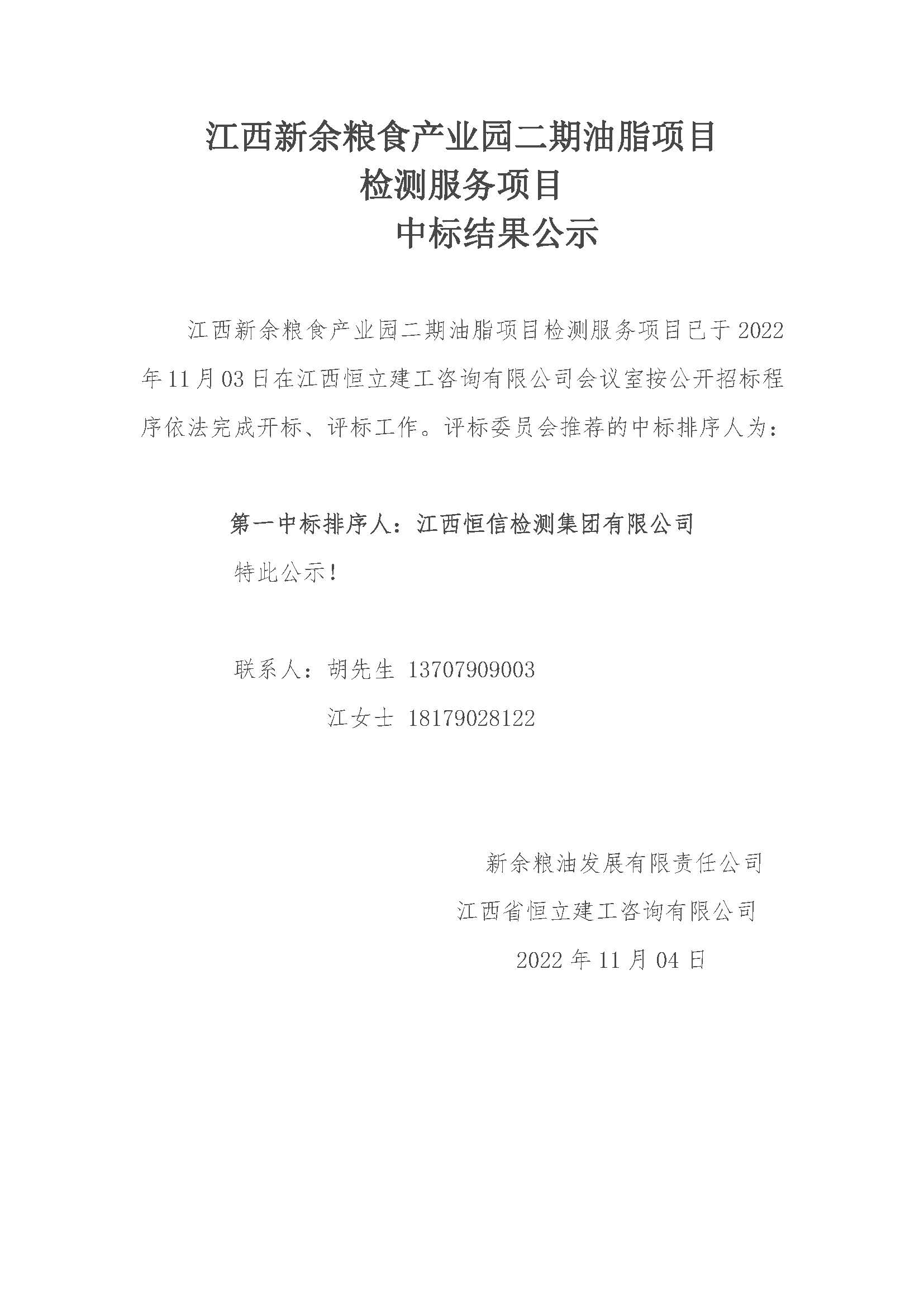 江西新余粮食产业园二期油脂项目中标结果公示