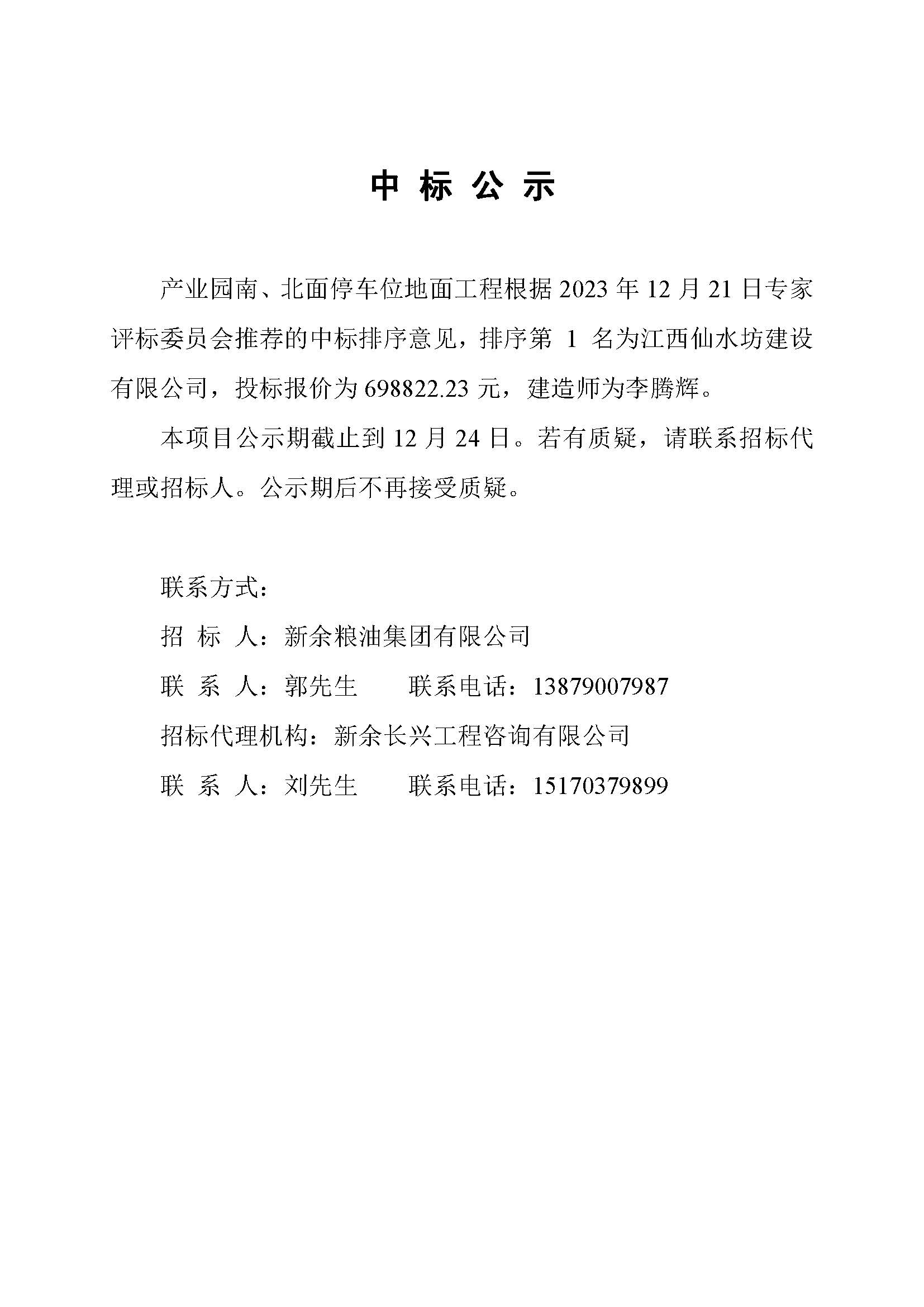 产业园南、北面停车位地面工程中标公示